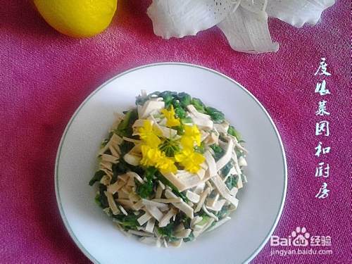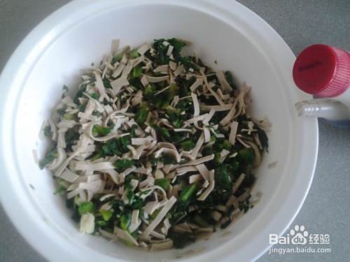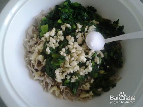 将莴笋叶和豆腐皮控水后切碎。将切碎的莴笋叶、豆腐皮、蒜泥放入大碗中,加入适量食盐。