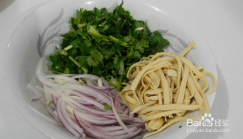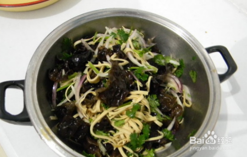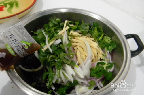 切好的豆皮,洋葱等放入木耳中,倒入沙拉汁大拌菜口味80ml。