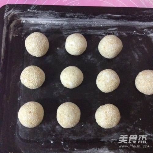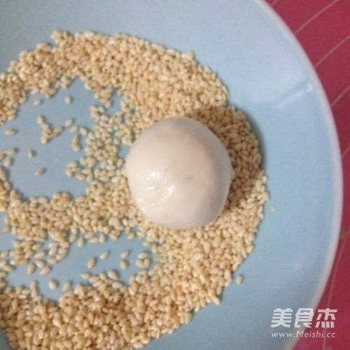 3分割每个为20g的小剂子,揉圆粘点水放入白芝麻的碗里,均匀裹上白芝麻。