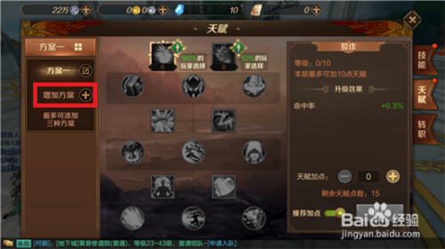 天赋总共可以有三页,点击方案旁边的按钮会出现【增加方案】的选项,点击即可重新添加天赋页,这个和英雄联盟的天赋很类似。
