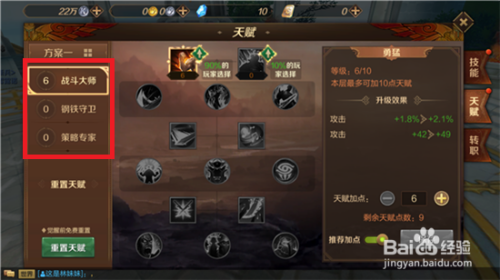 天赋总共有三类,分别为【战斗大师】、【钢铁守卫】以及【策略专家】,没个类别的属性方向是不同的,战斗大师主要提升的是攻击性,而钢铁专家则是防御,策略专家是命中率。