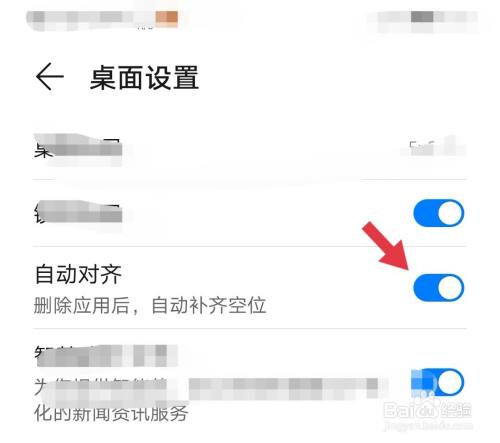 还可以通过在手机桌面双指捏合,弹出桌面设置,点击进去开启自动对齐