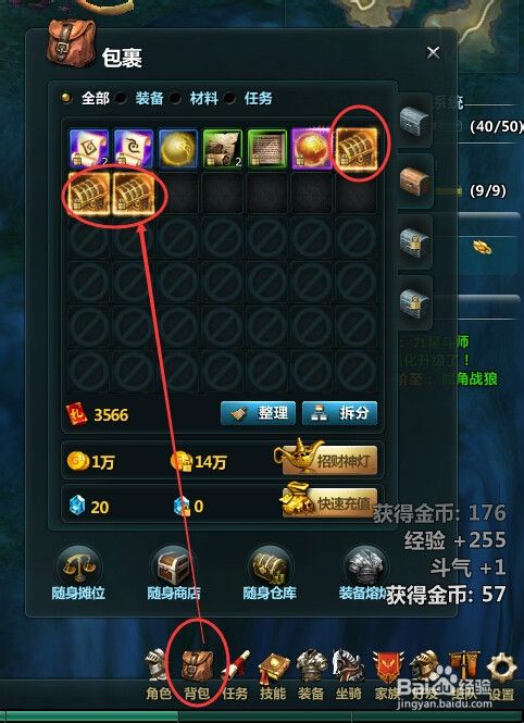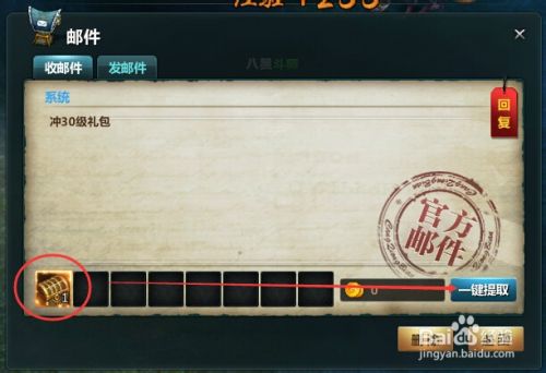 点击礼包邮件 有个一件提取 就可以提取我们的礼包到背包中去了