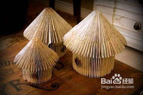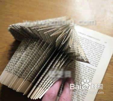 接下来的纸张就按照前面的这两步,不断的进行交叉的相关折叠和操作。即一页是折叠成一个简单的向内翻折的竖型,另外一个角则折叠成三角插的基本构型。这样的不断交叉折叠最终出来的效果就是我们在图示中所看到的,形成的整体结构中,下部是有一个向内的凹陷,而上部则是一个伞状的结构。这样独特的制作正是利用的书本独特的构造来完成的,不过由于书本的页数通常比较的多,所以在制作的过程中一定要有一定的耐心才可以哦。