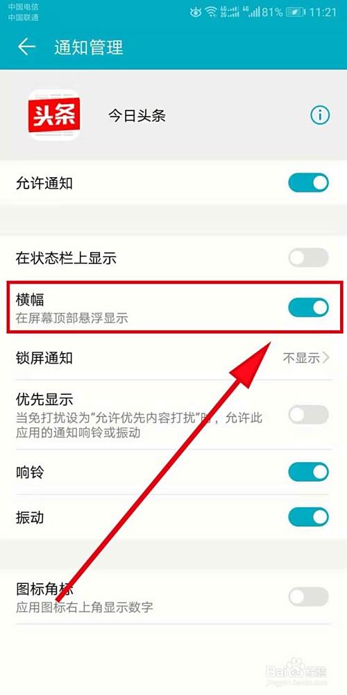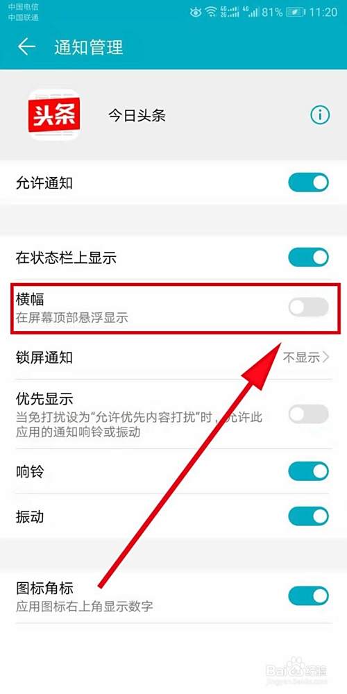 在打开的页面中找到“横幅”选项,默认是开启的,在这里将它关闭,这样,今日头条消息推送就不会再显示在手机顶端了