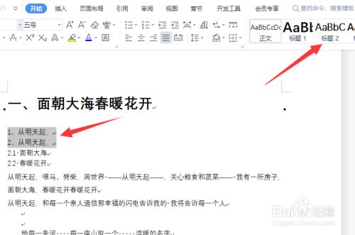 选择要设置为二级标题的内容,点击开始菜单栏下的“标题2”的样式,就能设置为二级标题样式