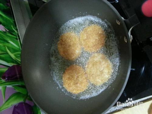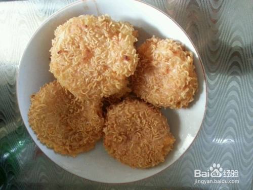 我用的这个干脆面,把揉好的圆球,裹一层面粉,多余的拍掉,然后再放到蛋液里过一下,最后在到干脆面里裹一层就可以进油锅了,平底锅放油,六成热就放进去煎