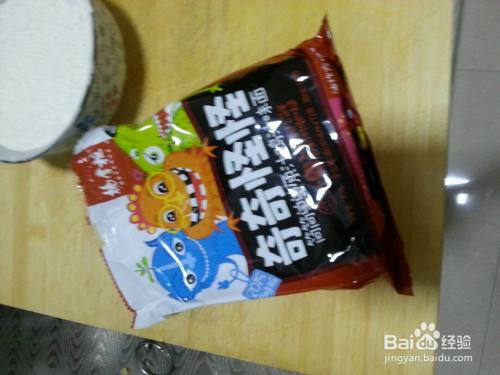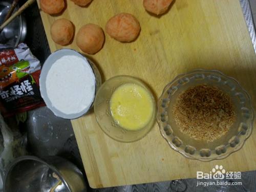 然后准备一小碗面粉,一个鸡蛋打散,干脆面捏碎沫(干脆面是救急用的,家里没有面包糠和馒头,只能凑合,但是味道也很美)