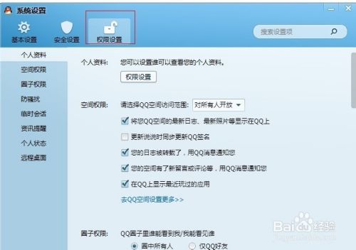 在找到权限设置的那个窗口,个人资料下面就是我们要找的空间权限了哦,我们接下来的操作就只要在这个空间权限设置里面勾选就行啦!