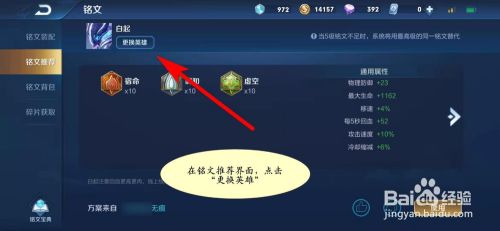 3、在铭文推荐界面,点击“更换英雄”