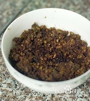 在核桃碎中加入红糖3瓷勺拌匀,然后用高压锅蒸熟。你可以看到这是个汤碗,核桃的量大约是一半不到一些。