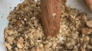 首先处理核桃,把剥好的核桃仁,用擀面杖或者石臼什么的捣碎。均匀一些,不要有太大的颗粒。