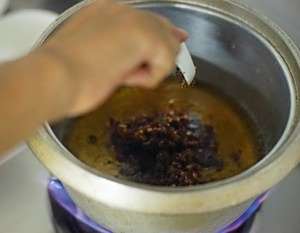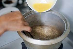 擦一些姜汁(不要带渣)入锅,开大火煮,放下之前蒸好的红糖核桃碎。在锅内搅拌均匀,待煮开后就可以调蛋了。