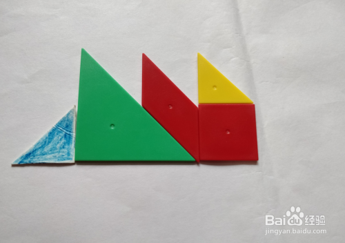 在绿色三角形的左侧,放上蓝色三角形挨着,下端一齐,如图。
