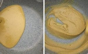 平底锅不刷油,倒入搅打好的豌豆糊,小火炒至。炒好的状态是用勺子舀起来低落不会马上消失就可以了。※我这个炒的太干了,大家炒的状态要我这个更湿润一些才能做豌豆黄。