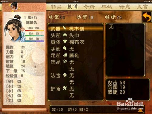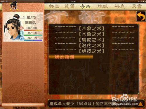 点击界面右上角的菜单按钮,可以进入菜单界面。包括物品、装备、奇术等设置内容。在物品栏可以使用或整理自己的各种物品。