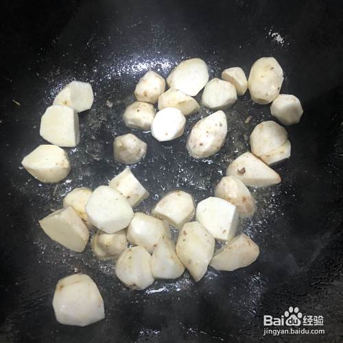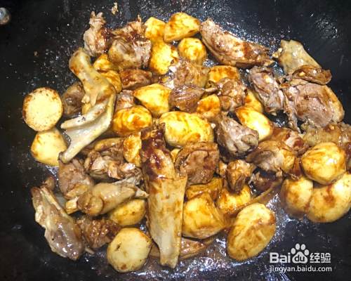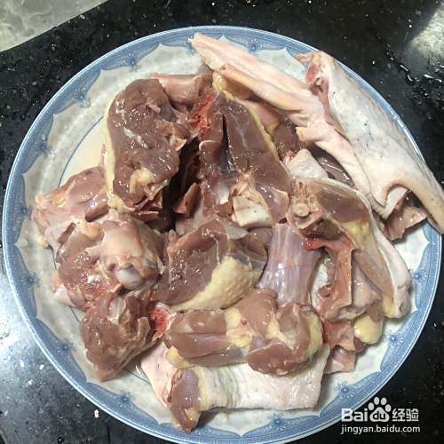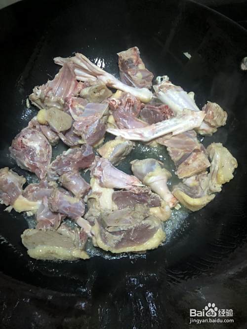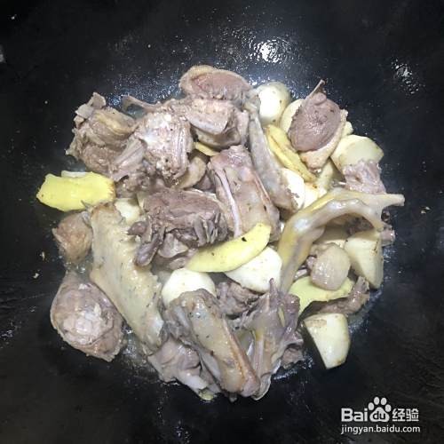 烧热锅,倒入油,加入鸭肉,翻炒1分钟,加入姜片,翻炒数次,盖上锅盖,炖1分钟。然后炒。