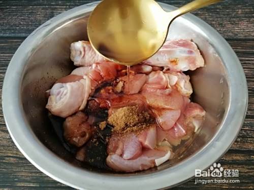 把鸡肉和所有的调味料搅拌均匀,然后腌制半个小时以上,让鸡肉入味。