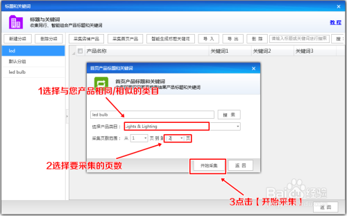 接着选择该产品类目,一般是选择与自己店铺产品相同的或相似的类目,这里以Light&Lighting分类作为例子,然后再选择要采集的页数,点击【开始采集】,就可以进行采集了。如图所示: