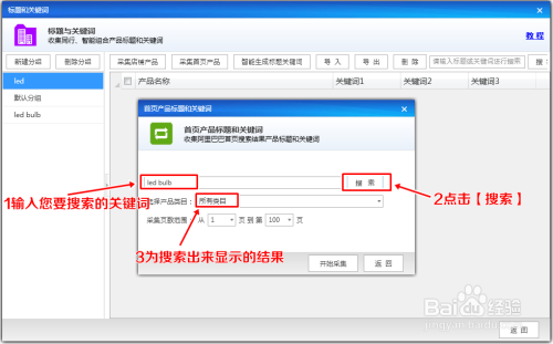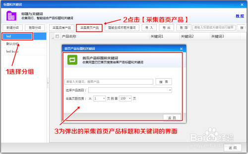 然后点击该界面上边的【采集首页产品】功能按钮,软件会弹出【采集首页产品标题与关键词】界面,如图所示: