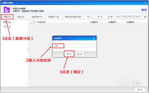 来到标题与关键词界面,先新建一个分组并给分组命名,以led作为分组名称为例,输入名称后点击【确定】。如图所示: