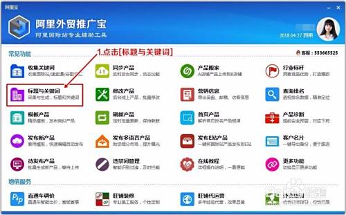 打开阿里外贸推广宝软件,来到主界面,点击主界面上的功能【标题与关键词】,如图所示: