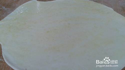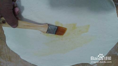 将圆饼擀大薄饼,用油刷刷上植物油,将整个大面薄饼都刷满。