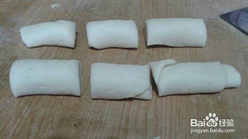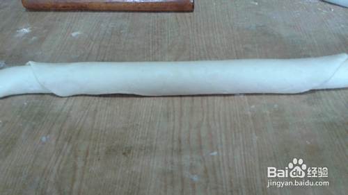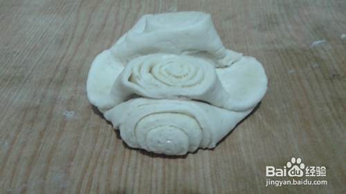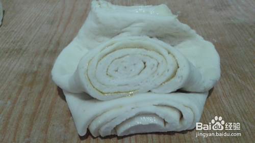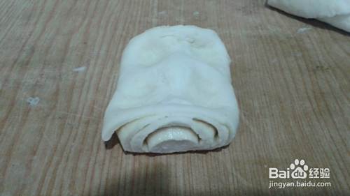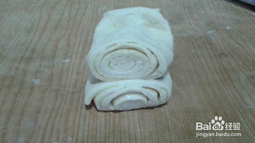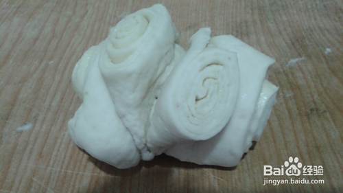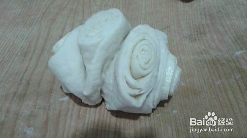 竖着拿起一个面段,用两手大拇将上下两头捏扁平,再拿一个面段照第一个做,再将两个叠放在一起,两手在面身中间两侧捏抻,再用两手捏住面,左手向前拧,右手将后拧,将面段拧成花卷,如图。