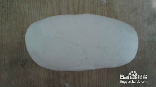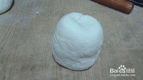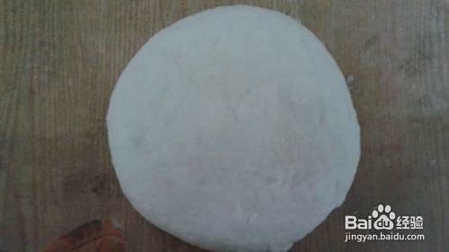面团发酵好,在面板上揉成短圆柱,再倒竖过来,用手按成圆饼。