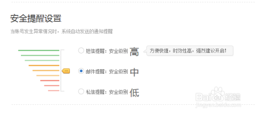 中间这里可以设置 安全提醒设置, 当帐号发生异常情况时,系统自动发送的通知提醒 ,我们设置三个不同的提醒级别。,分别是手机短信提醒,这个是最高的, 然后是邮件题醒。最后是站内信息提醒。