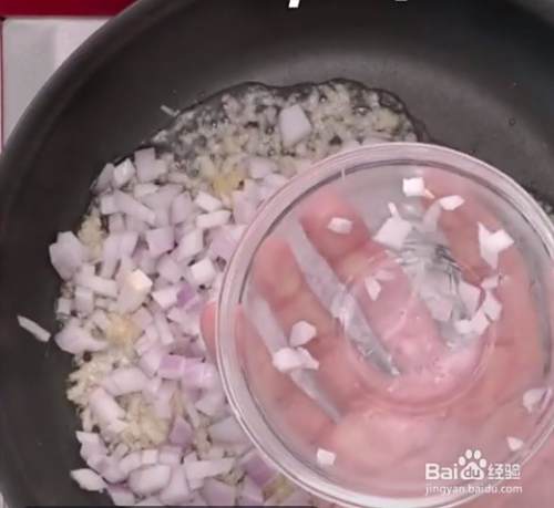 把洋葱剁碎,待煸香大蒜以后放入洋葱