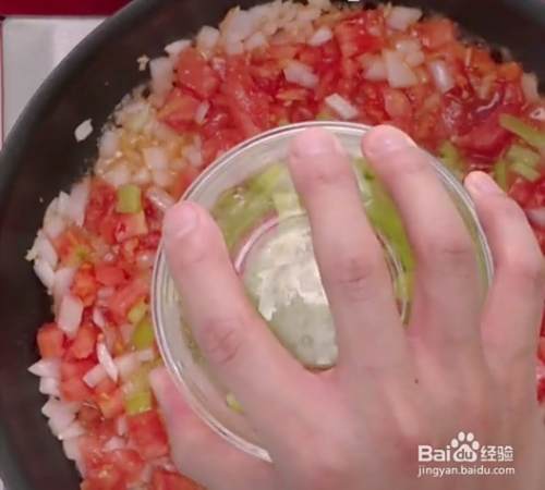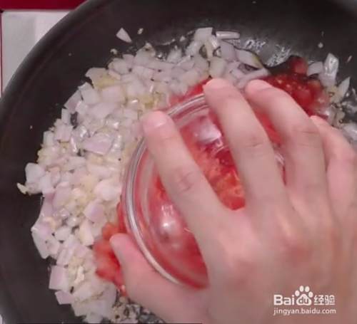 西红柿切为小块,翻炒几遍洋葱后再放入西红柿炒出西红柿的水分