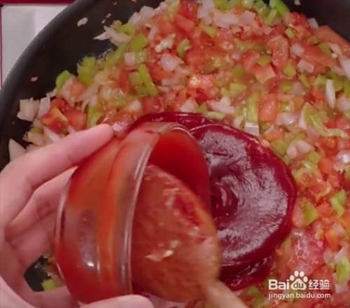 西芹切小粒,放入碗中,准备五勺番茄酱,放入锅中