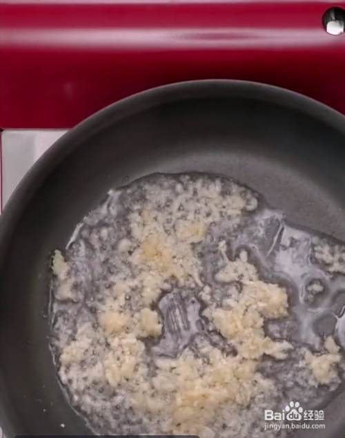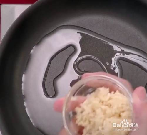 锅中倒入油烧热至六成,把大蒜剁碎,放入碗中煸香