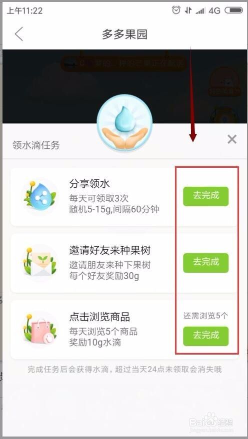 点击:领水滴 按钮,会打开一个每天的任务页面,按照提示可以进行点击并完成,正确操作后再返回回来后会出已经有了水滴可以直接领取了,领取成功的水滴建议及时浇果园,否则会被偷取走。