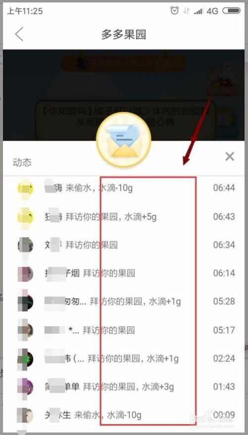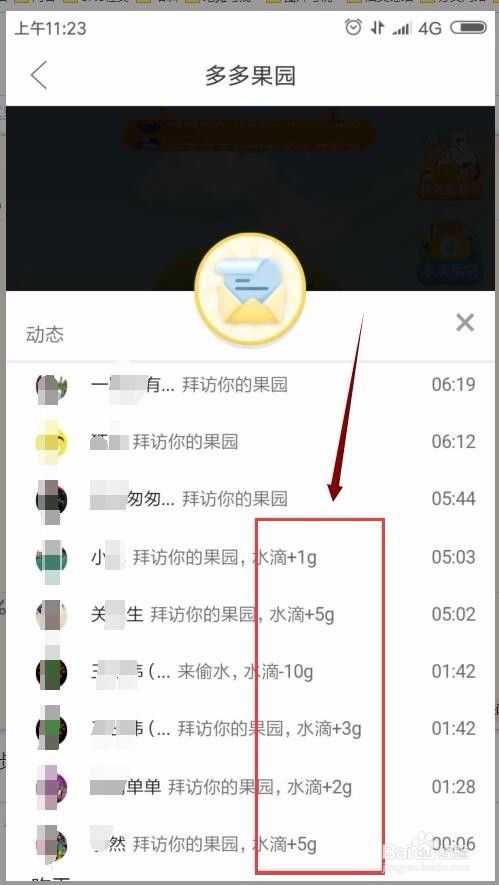 如下点击的是:动态,会看到自己果园不同时间段被好友偷取的水滴数量与次数,同时也有好友给自己果园添加水滴的记录。