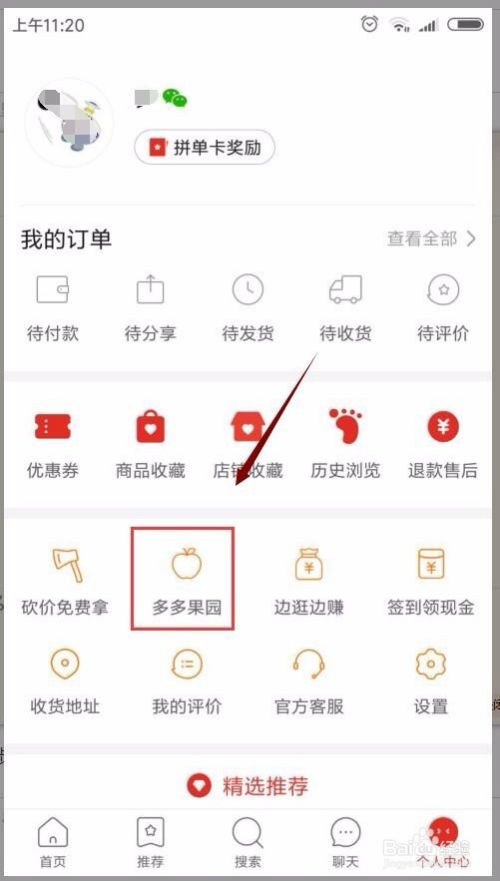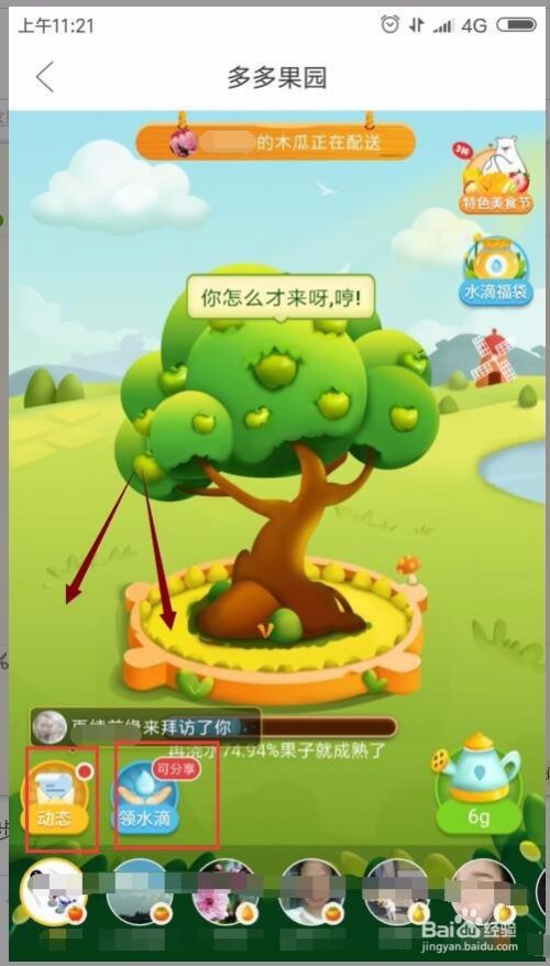 点击后进入如下窗口,在此窗口中找到并点击:多多果园,进入果园窗口内去完成任务并获取水滴,同时也可以偷取好友水滴。