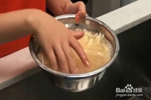 把切好的土豆丝放在凉水中浸泡,浸泡土豆是最好加入一点白醋,可以保证口感爽脆。