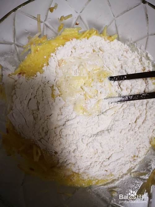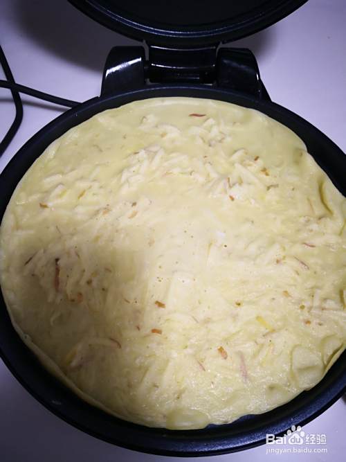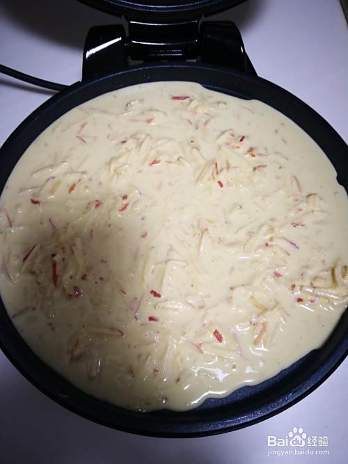 搅拌均匀成糊状,电饼铛加热刷上少许油倒入面糊。