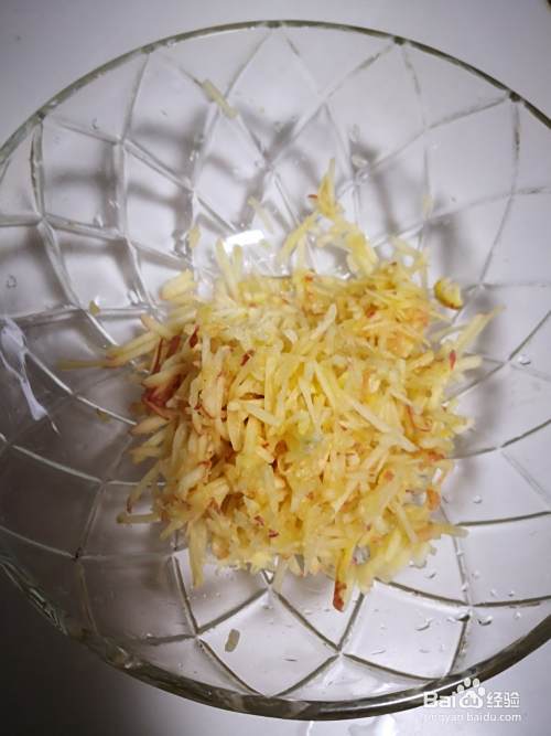 苹果切丝放入盆中。