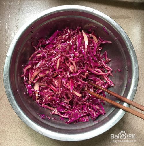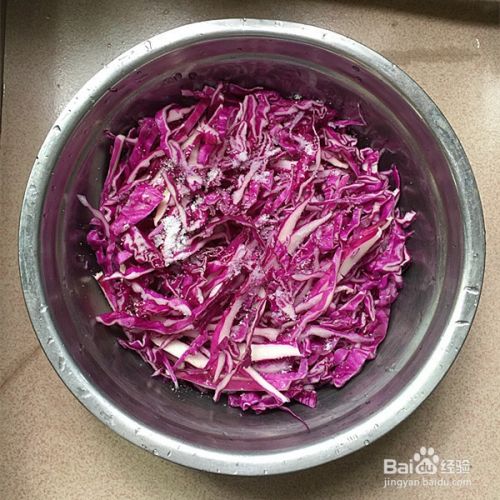 切成丝后倒入深碗中,加精盐拌匀后腌3分钟。