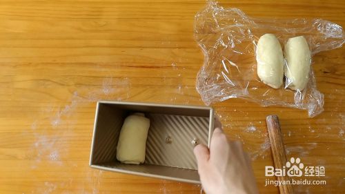 擀好后,大约有2-3个这样的圆圈,然后按同样的螺旋方向放入吐司箱中进行二次发酵。