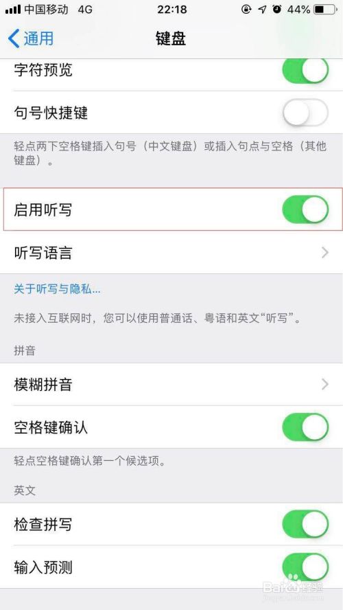 进入键盘界面后,下滑,可以看到“启用听写”此开关按钮,关闭iPhone 键盘的听写按钮只需将此开关关闭即可,启用也是一样的操作入口。