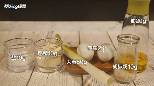 1准备2个鸭蛋,50克大葱,10克鸡精,10克盐,10克胡椒粉,20克油。