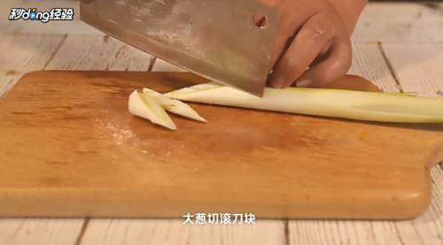 2鸭蛋打入碗中搅散,大葱切滚刀块,锅中倒油,烧热后倒入鸭蛋。
