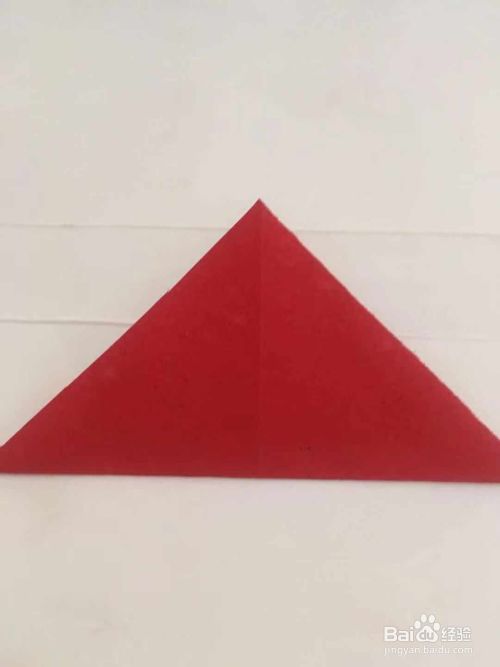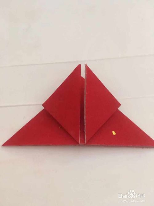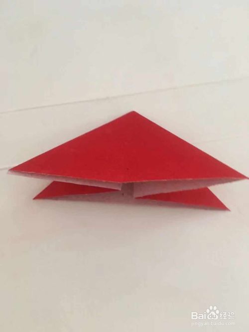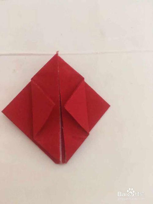 第一步 把一张16厘米的正方形红色彩纸 对角折叠两次 再对边折叠两次 然后再对边线聚拢 折叠成为一个小双三角