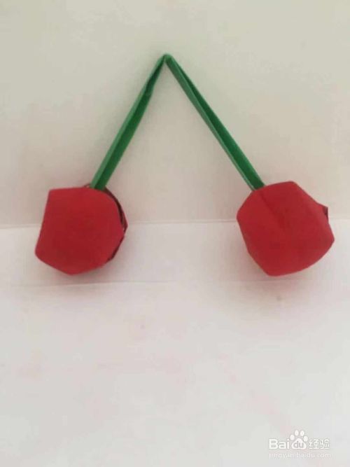 第六步 吹鼓起来之后 再折一粒 然后再用绿色彩纸折叠一根樱桃的枝梗折弯一下安上 两粒漂亮鲜艳的小樱桃就制作完成了