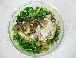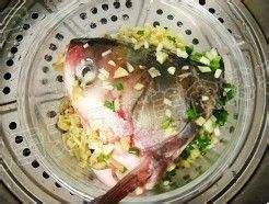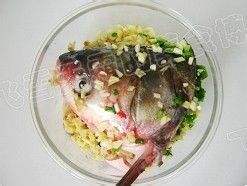鱼头上用少许盐抹一下,放一半的葱姜蒜末在容器中