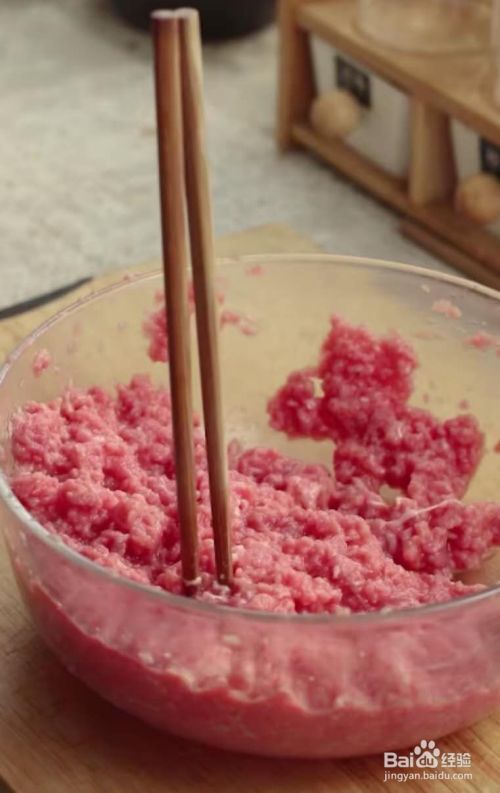 牛肉剁馅,花椒水分三次加入,每加入一次都沿同一个方向搅拌,一直搅拌到筷子可以立在里面不倒。