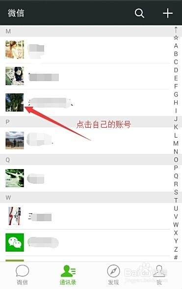 在首页中点击底部的通讯录,打开页面通讯录页面。并且在页面中找到自己的账号并点击。